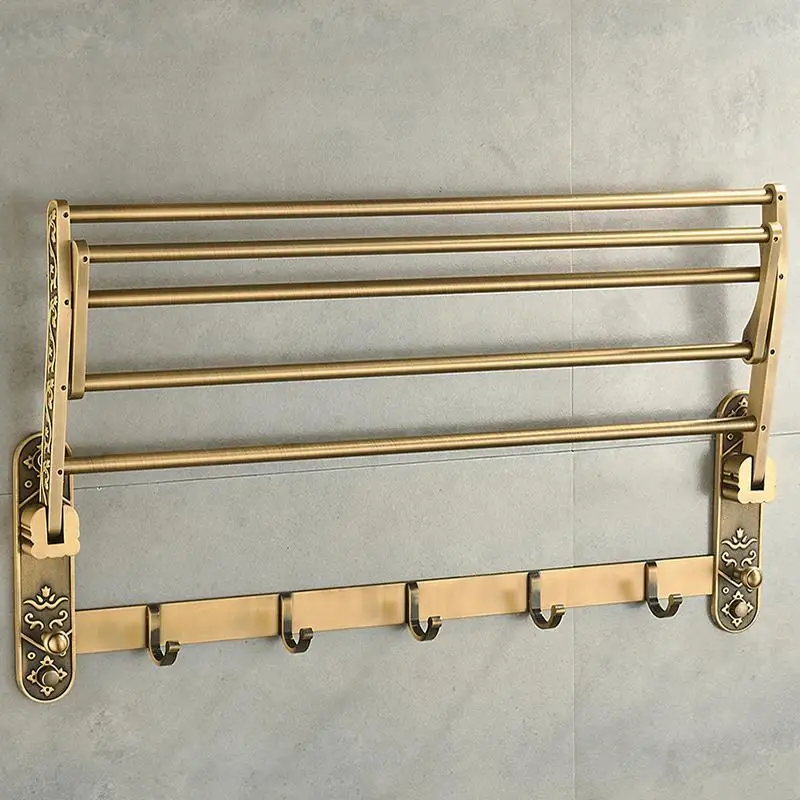 Aluminium Foldable Antique Brass Towel Rack with Shelf & Hooks