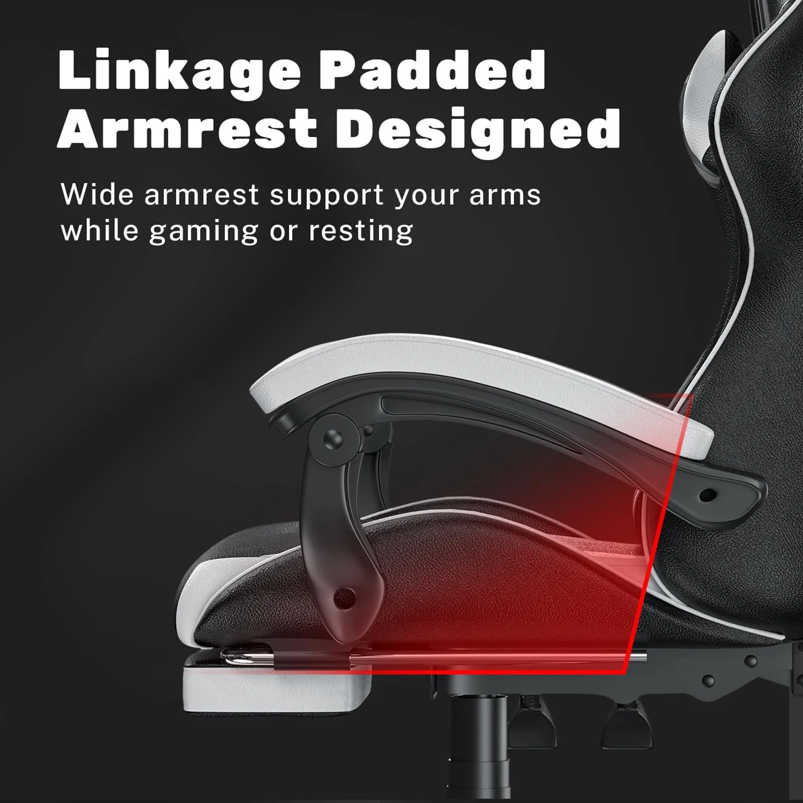 Ergonomic gaming chair with footrest, lumbar cushion, and headrest. Reclines 90°–155° for total comfort. Easy to clean, height adjustable, and perfect for gaming or office use.