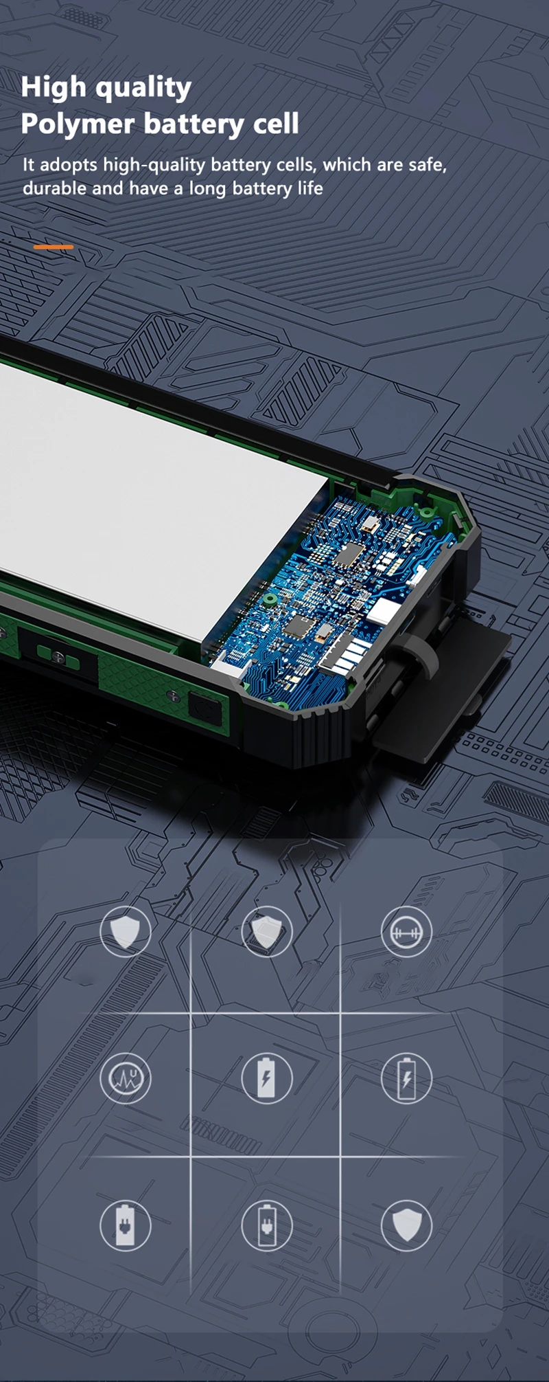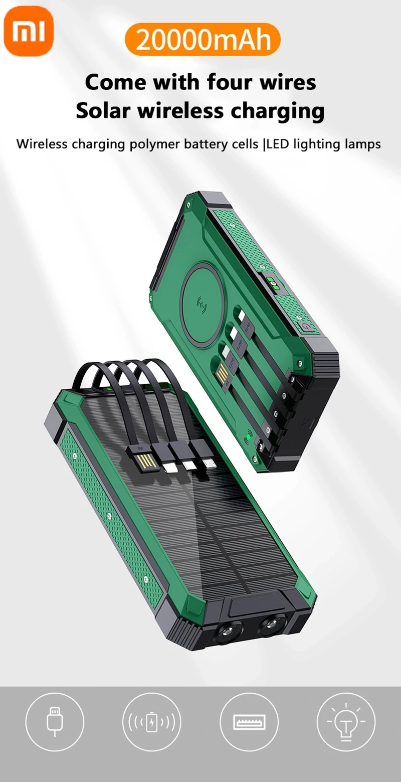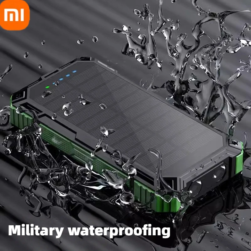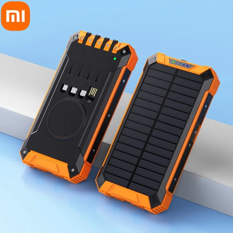 High-capacity XIAOMI solar power bank with up to 20,000mAh, wireless & USB charging, built-in cables, LED flashlight, and portable design for travel, survival, and emergencies.